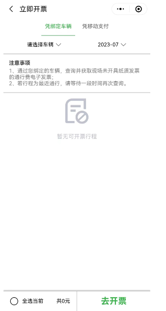 第二步:绑定车辆后,选择“去开票”(通过绑定的车辆,查询并获取现场未开具纸质发票的通行费电子发票)