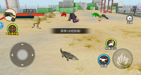 2、利用虚拟摇杆控制着自己的小鳄鱼四处探索,遇到可以吃的东西立马提升经验值。