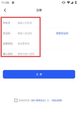 2、在注册页面,依次填写【手机号】【验证码】、【设置密码】【确认密码】。