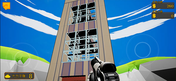 5、就可以快速爆破掉整栋楼,花越少的子弹就能够获得越高的分数,右上角会显示当前的分数和可以获得的金币。