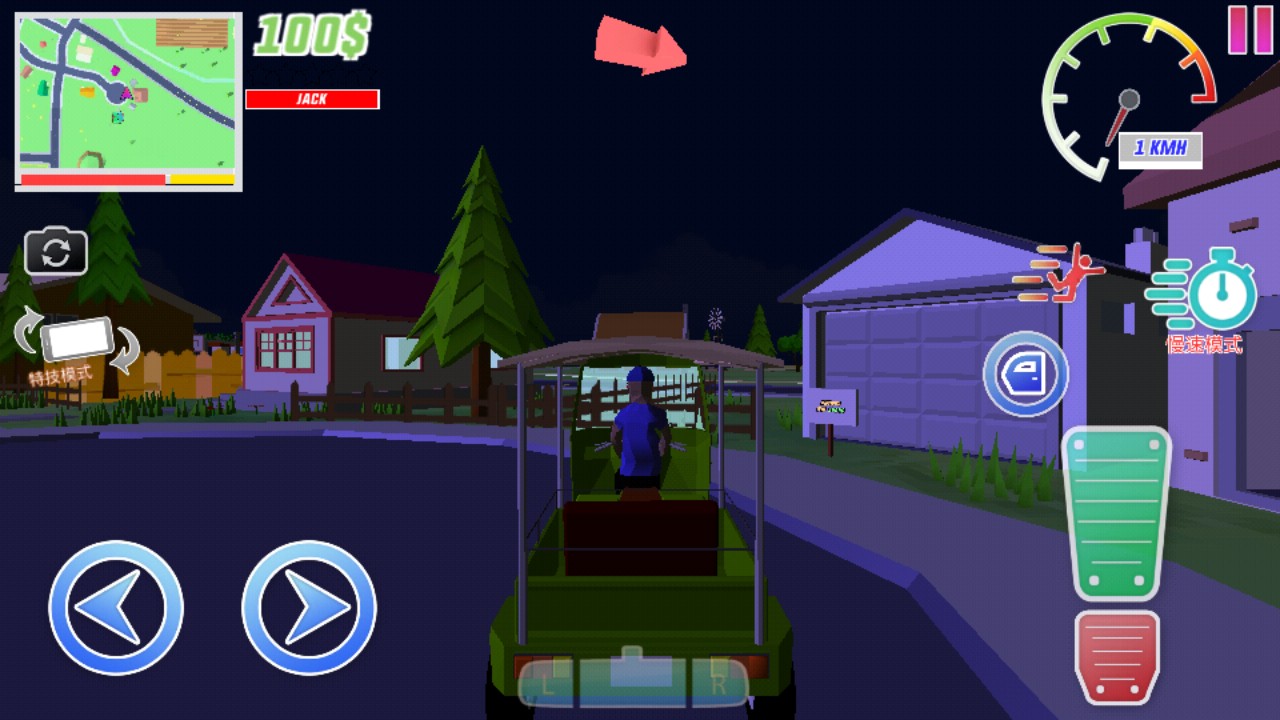 8、如图,通过左下角方向键和右下方刹车油门按钮控制车辆前往目的地,以上就是DudeTheftWars最新版的玩法了。