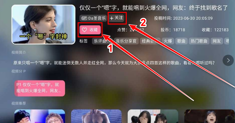 4.点击收藏还可以收藏自己喜欢的作品,点击+关注还可以关注自己喜欢的up主。