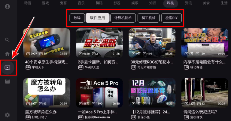2.点击电视,就会看到有数码、电视应用、计算机技术、科工机械、极客DIY等几个板块内容,同理也是想看哪个板块内容就直接点击板块栏目即可。